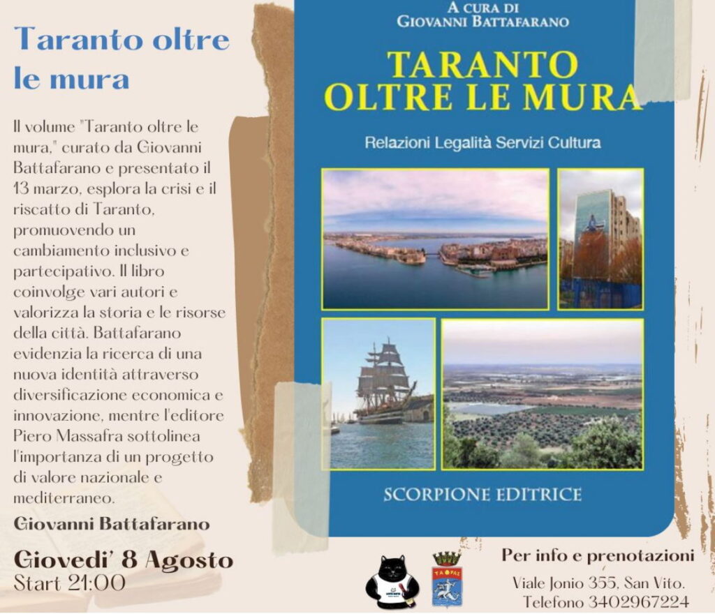 Giovedì 8, sarà la volta del volume, a più firme, curato da Giovanni Battafarano che analizza la crisi e la voglia di riscatto della città di Taranto, promuovendo un cambiamento inclusivo e partecipativo. Il libro valorizza la storia e le risorse della nostra città.